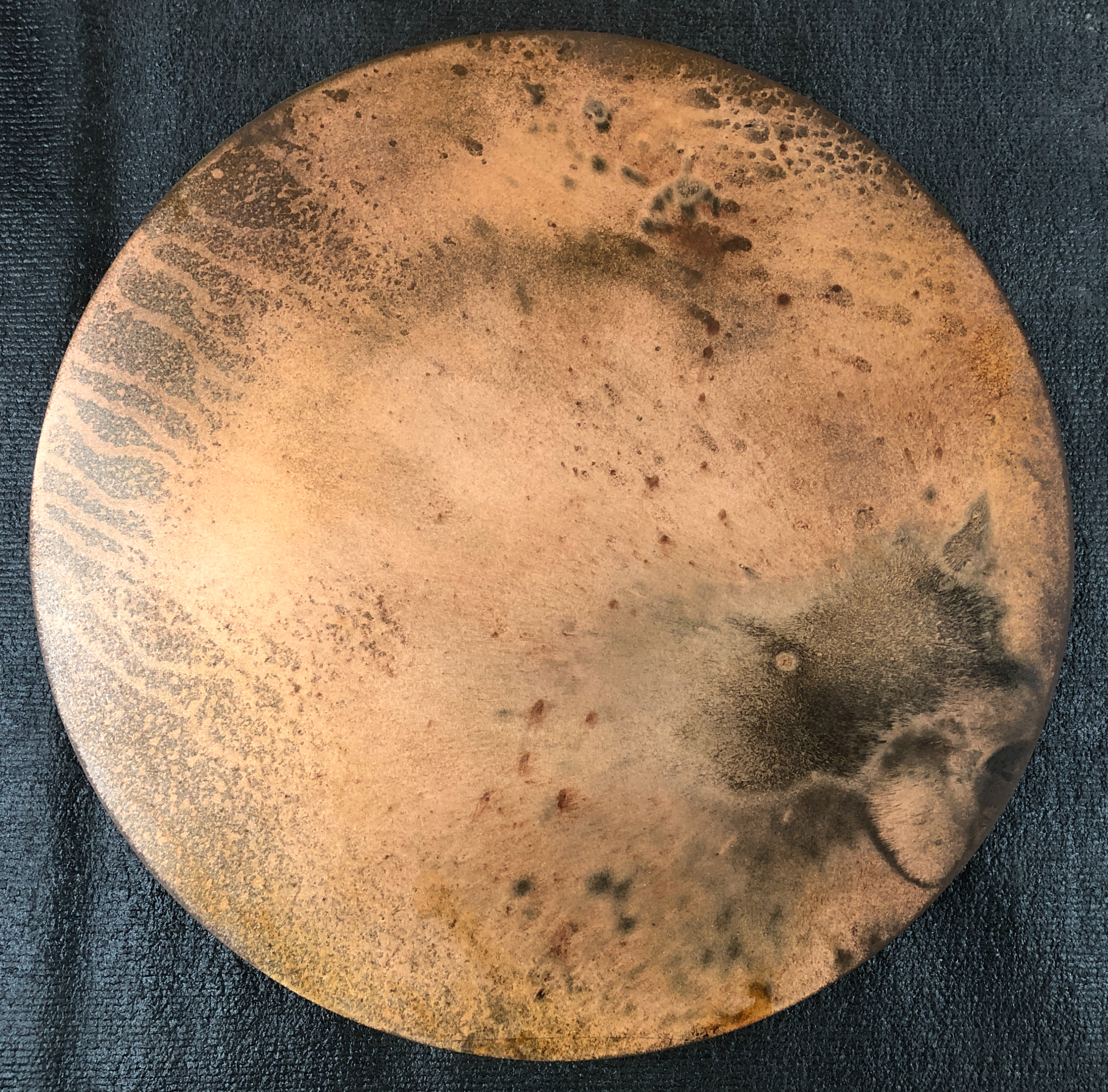 Patinated Steel Lazy Susan; 15" in diameter; 3/16" thick plate steel on a wooden base with a super-smooth and quiet turntable mechanism.