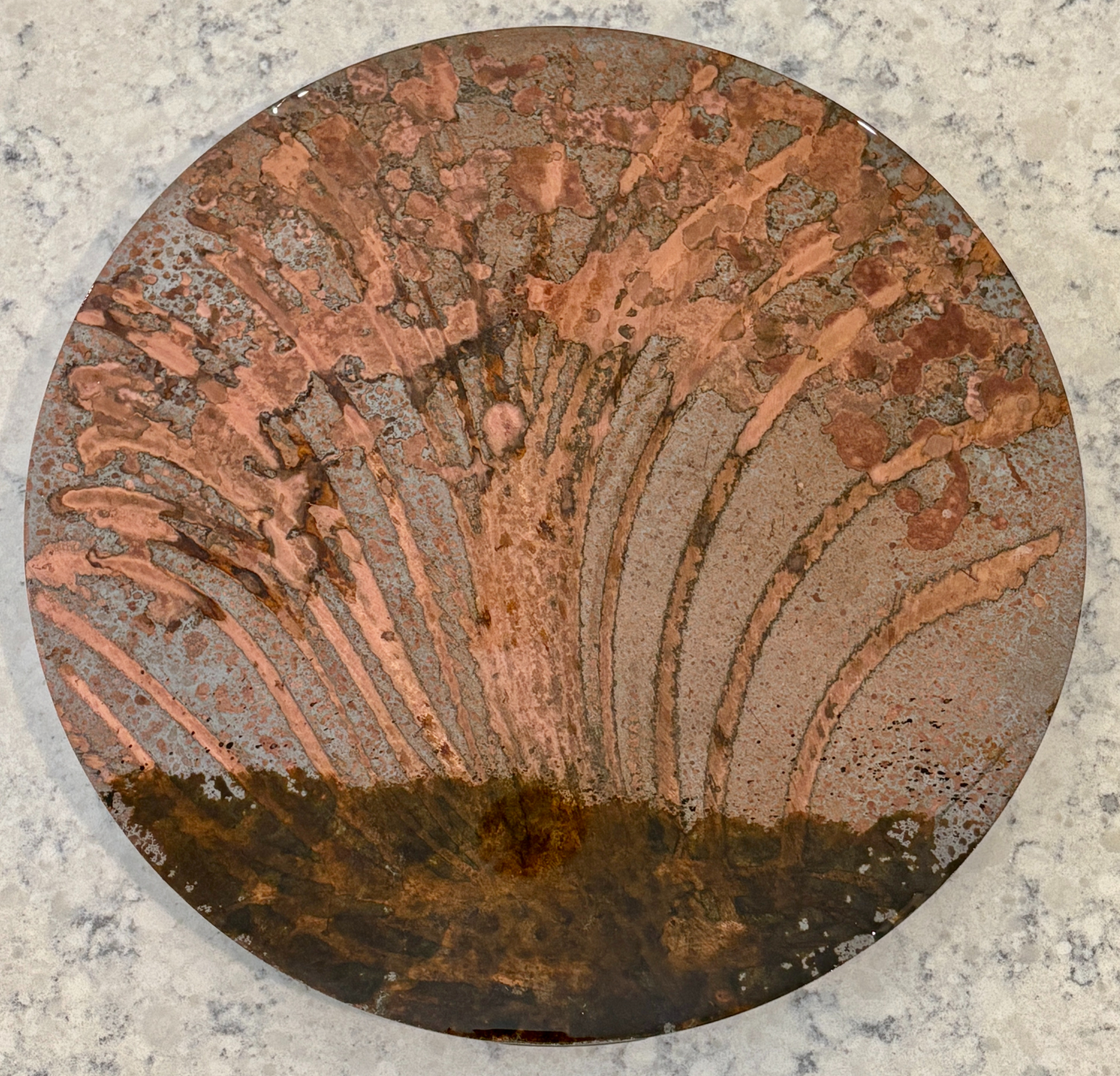 Patinated Steel Lazy Susan coated with clear epoxy; 15" in diameter; 3/16" thick plate steel on a wooden base with a super-smooth and quiet turntable mechanism.